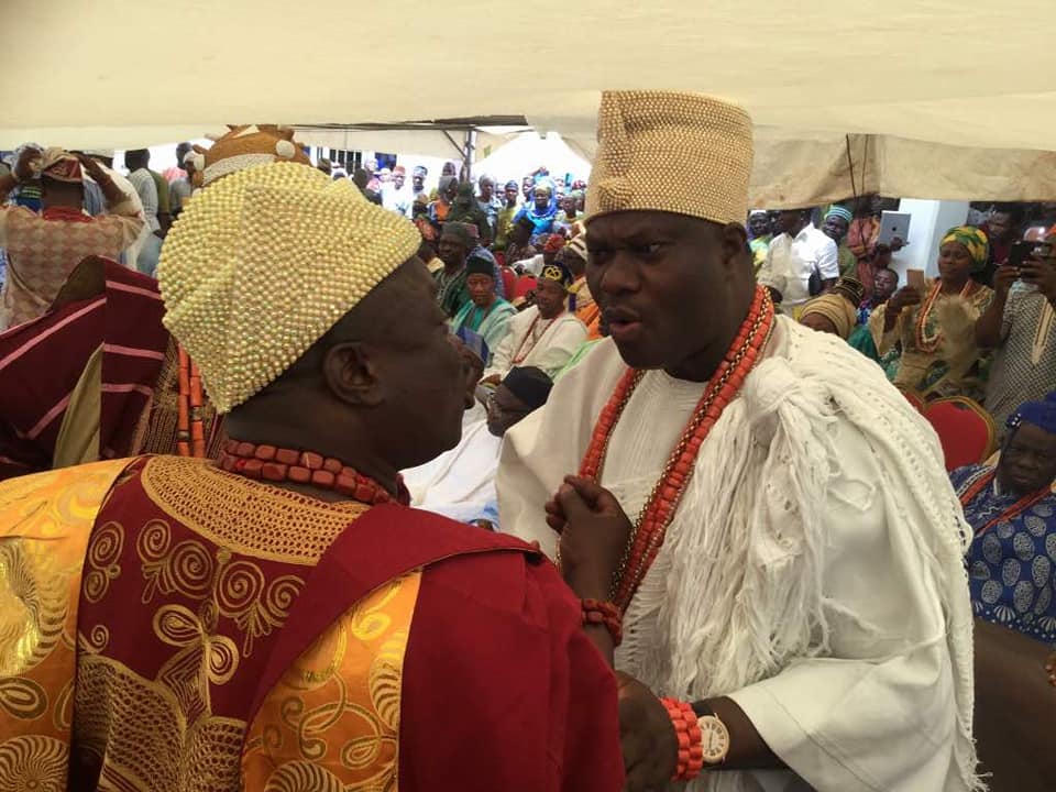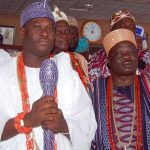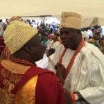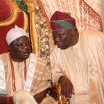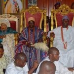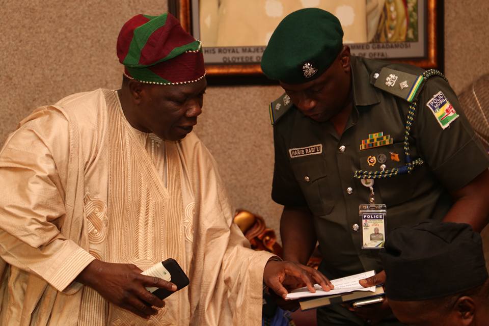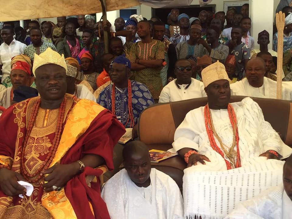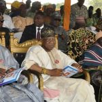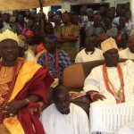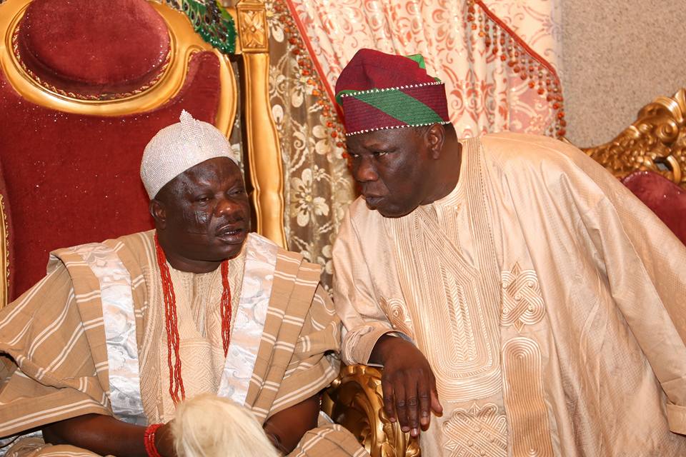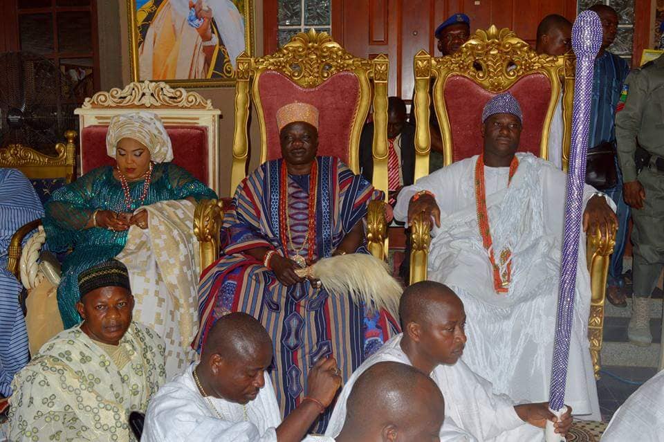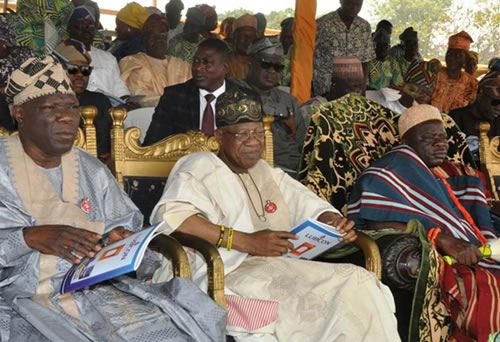 President of Offa Descendants Union, Alhaji Najeemdeen Usman Yasin (left), Minister of Information and Culture, Alhaji Lai Mohammed and the Olofa of Offa, Oba Mufutau Okikiola Muhammed-Gbadamosi at the 2017 Ijakadi Offa Festival in Offa, Kwara State